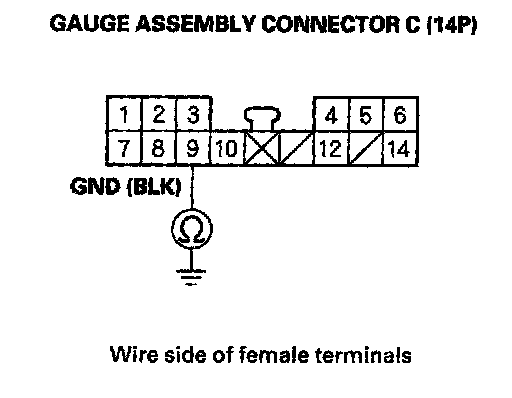 14. Turn the ignition switch OFF, and check for continuity between terminal C9 (BLK) and body ground. There should be continuity to ground under all conditions. If there is no continuity, check for an open in the wire, or poor ground (G502).