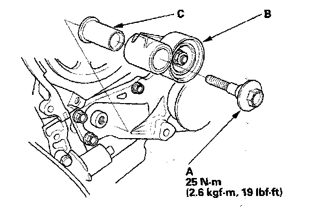 - 1 Hold the pulley with the handle (A) and holder attachment (B), then tighten the bolt to 64 Nm (6.5 kgf-m, 47 ft. lbs.) with a torque wrench and heavy duty 19 mm socket (C).