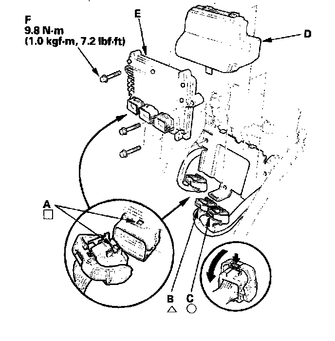 NOTE: PCM connectors A, B, and C have symbols (A=[square], B=[triangle], C=[circle]) embossed on them for identification.