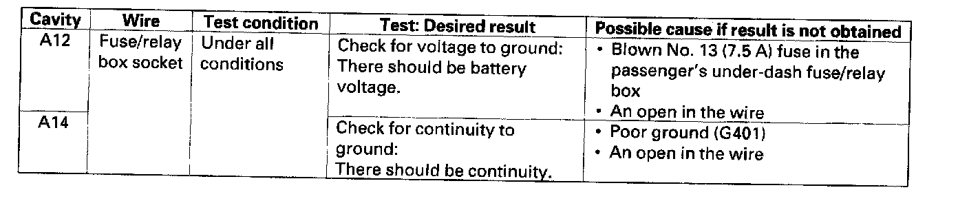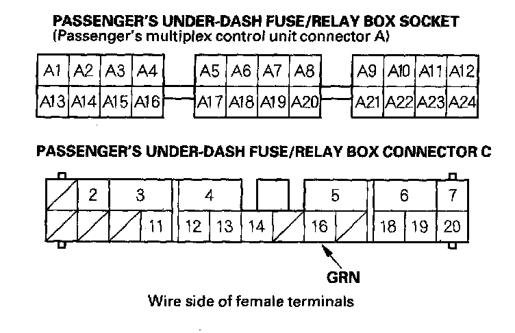 4. With the passenger's multiplex control unit still disconnected, make these input tests at the passenger's under-dash fuse/relay box socket.