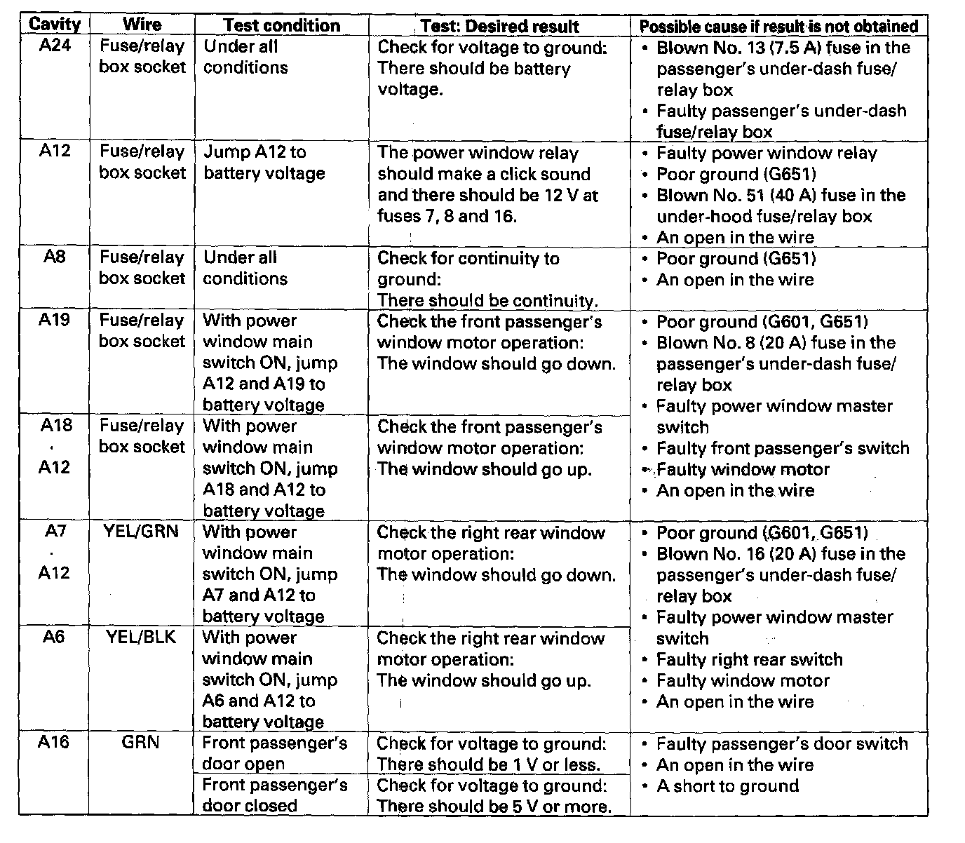 9. Remove the passenger's multiplex control unit from the passenger's under-dash fuse/relay box and connect fuse/relay box socket terminal A12 to battery voltage.; This turns the power window relay on.