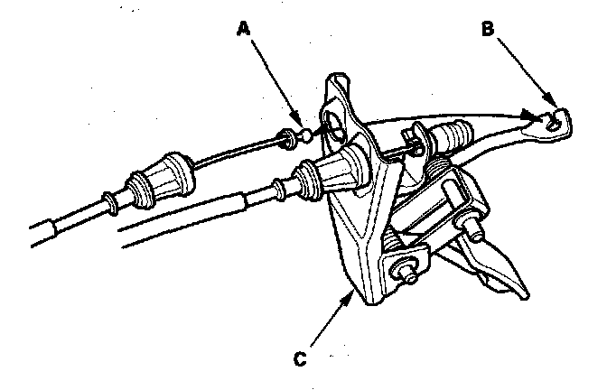 4. Disconnect the actuator cable end (A) from the arm (B) on the accelerator pedal assembly (C).