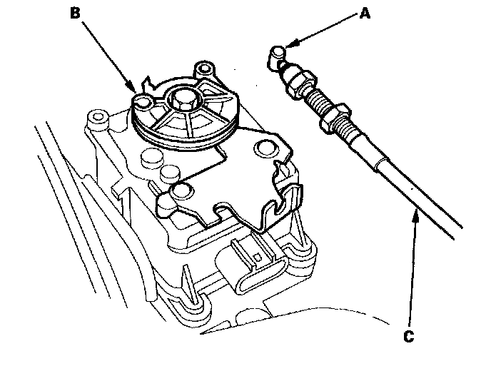 2. Disconnect the actuator cable end (A) from the output linkage (B), and remove the cable (C) from the cruise control actuator.
