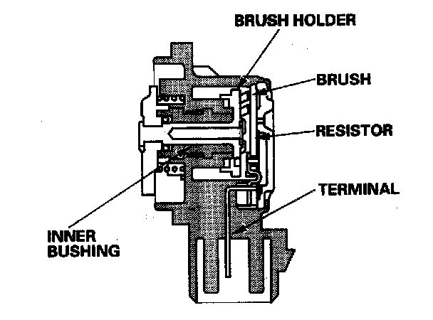 Throttle Position (TP) SensorThe TP sensor is a potentiometer connected to the throttle valve shaft. As the throttle position changes, the sensor varies the signal voltage to the ECM. The TP sensor is not replaceable apart from the throttle body.