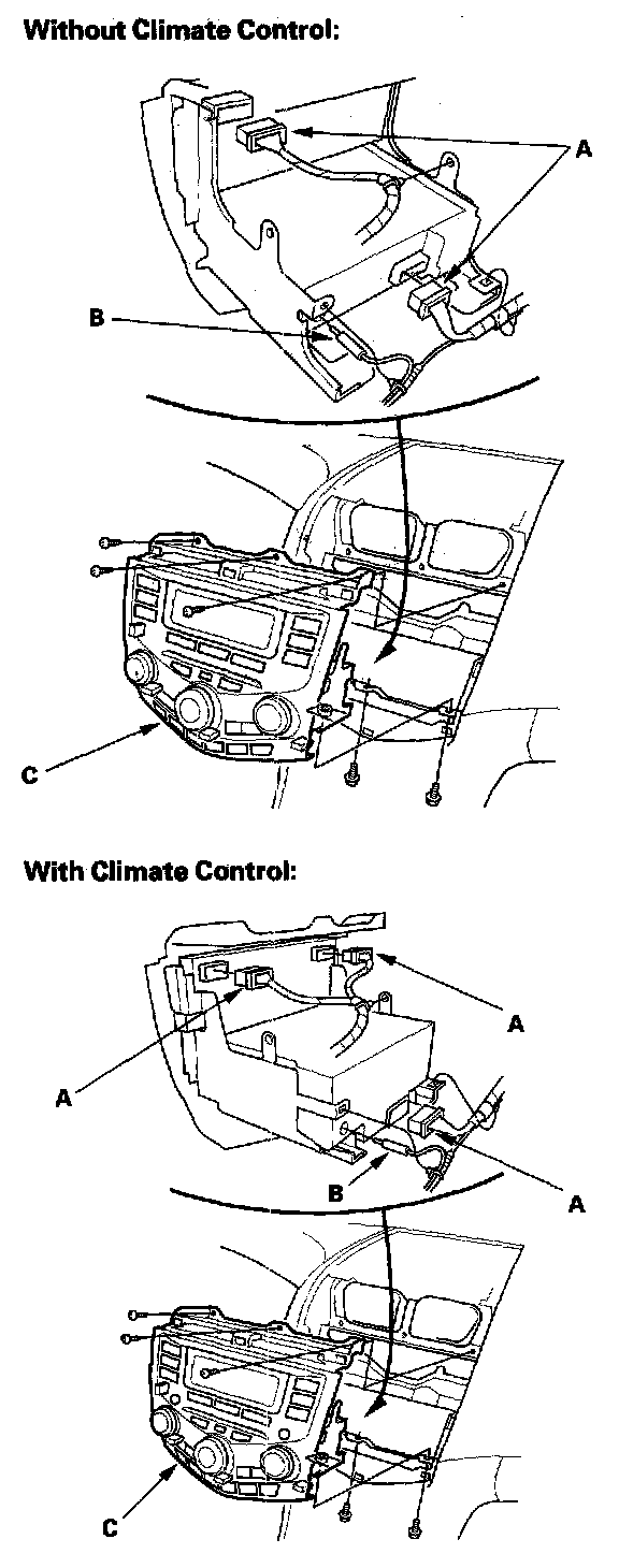 4. Remove the screws and bolts, disconnect the audio-HVAC display module connectors (A) and the antenna lead (B), then remove the audio-HVAC display module (C).