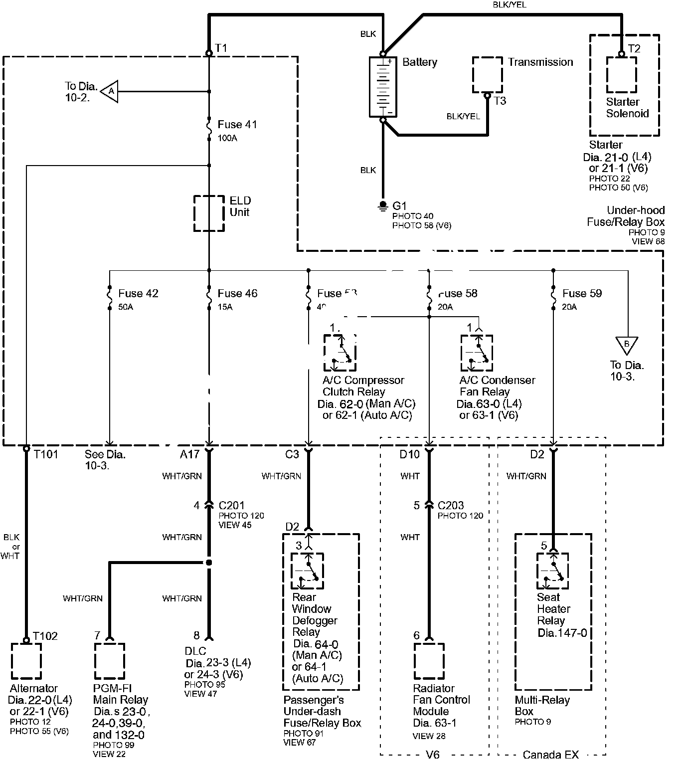 Power Distribution schematics show how power is supplied from the positive battery terminal to various circuits in the vehicle. Refer to the Power Distribution Diagram Set to get a more detailed understanding of how power is supplied to the circuit you're working on. Individual circuit schematics begin with a fuse. So if Power Distribution shows that an inoperative circuit and another circuit share a fuse, check a component in the other circuit. If it works, you know the fuse is good and power is available to the inoperative circuit.