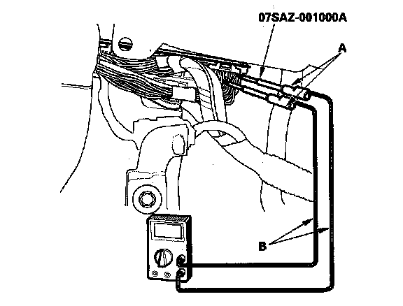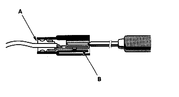 3. If you cannot get to the wire side of the connector or the wire side is sealed (A), disconnect the connector and probe the terminals (B) from the terminal side. Do not force the probe into the connector.
