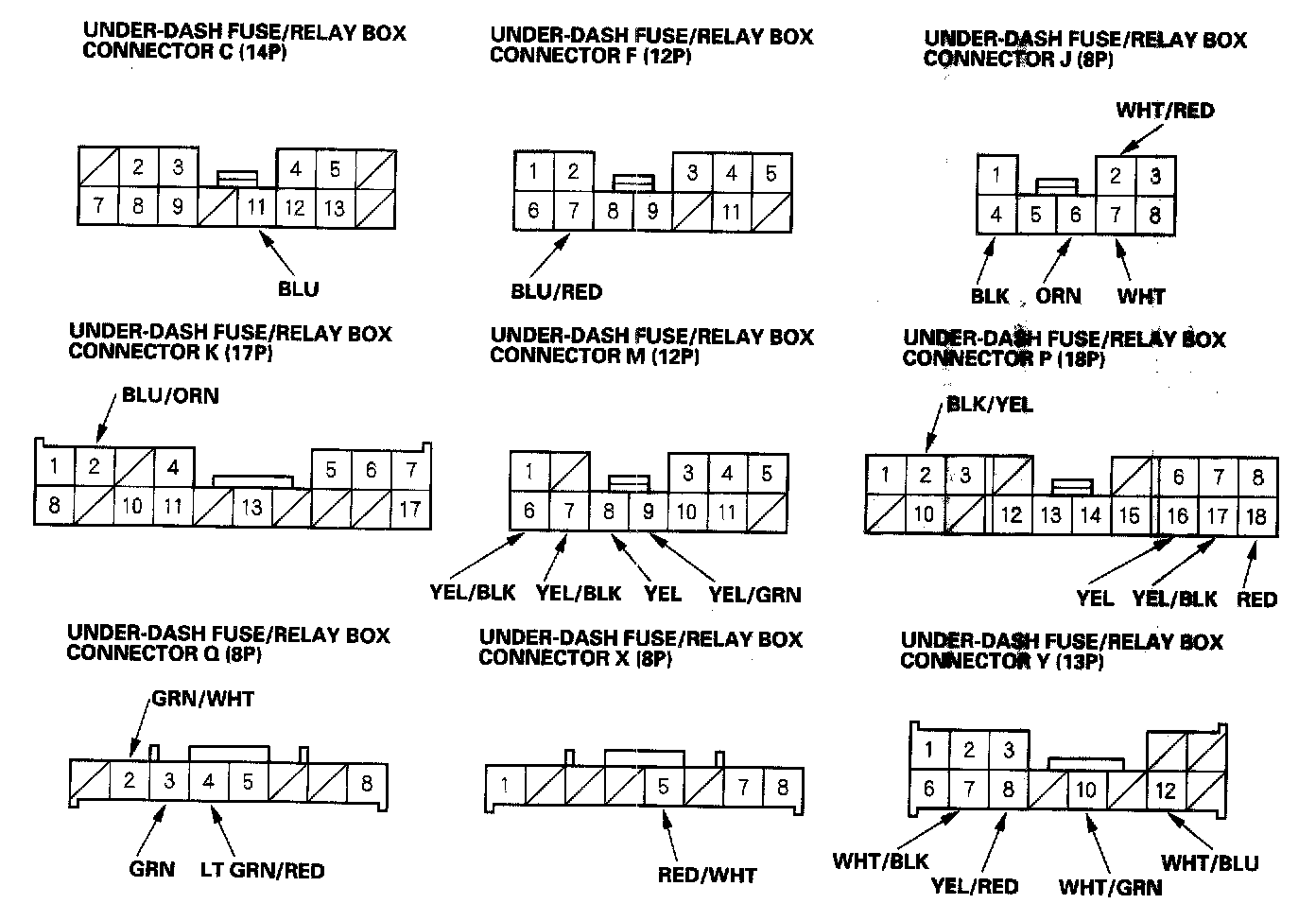 5. Reconnect all connections to the under-dash fuse/relay box, and make these input tests at the appropriate connectors on the under-dash fuse/relay box.