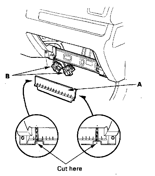 9. Cut the plastic cross brace in the glove box opening with diagonal cutters in the area shown. Remove and discard the plastic cross brace (A).