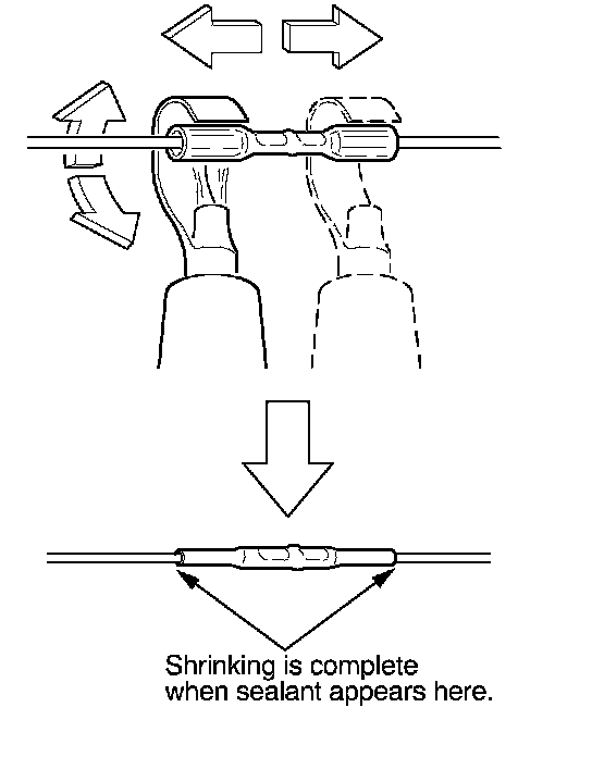13. Plug in the heat gun, and turn it on. Start at the middle of the splice connector, and move the gun toward the ends as the tube shrinks. Apply heat evenly by rotating the curved heat spreader around the splice connector. Shrinking is complete when a small amount of sealant appears at each end of the tube.