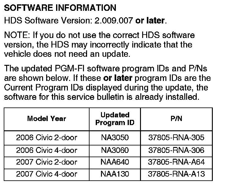 Update the PGM-FI software with the HDS and software version 2.009.007 or later. Refer to Service Bulletin 01-023, Updating Control Units/Modules.