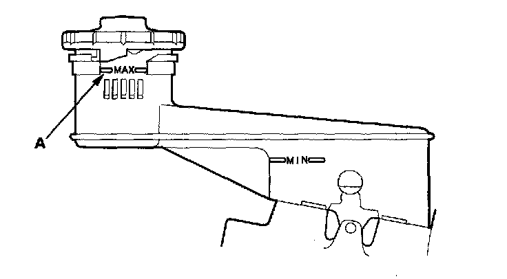 1. Make sure the brake fluid level in the reservoir is at the MAX (upper) level line (A).