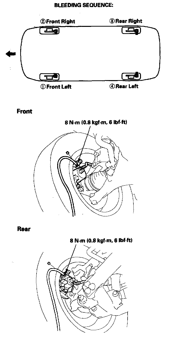 5. Repeat the procedure for each caliper until no air bubbles are in the fluid. Bleed the calipers in the sequence shown.