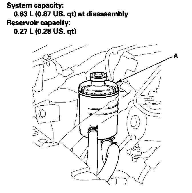 Fluid ReplacementCheck the reservoir (A) at regular intervals, and add the recommended fluid as necessary. Always use Honda Power Steering Fluid. Using any other type of power steering fluid or automatic transmission fluid can cause increased wear and poor steering in cold weather.