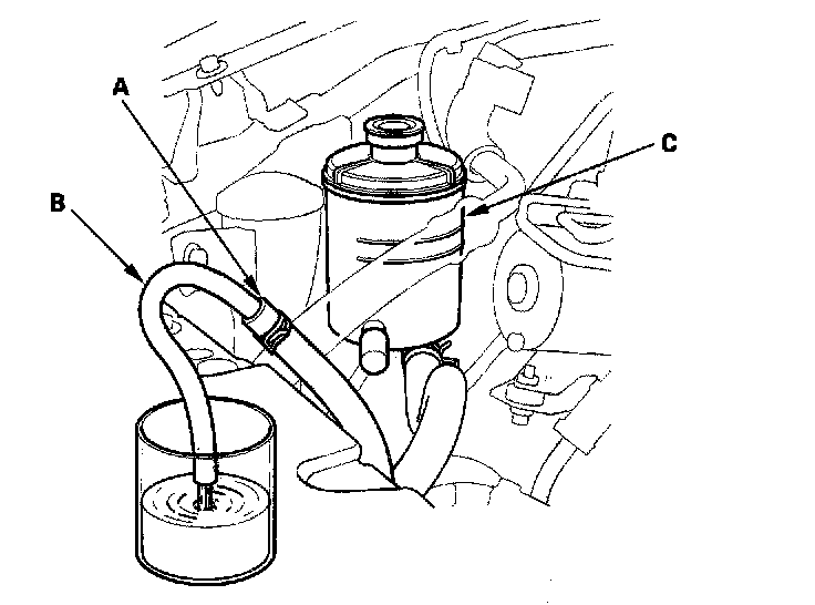 3. Start the engine, let it run at idle, and turn the steering wheel from lock-to-lock several times. When fluid stops running out of the hose, shut-off the engine. Discard the fluid.
