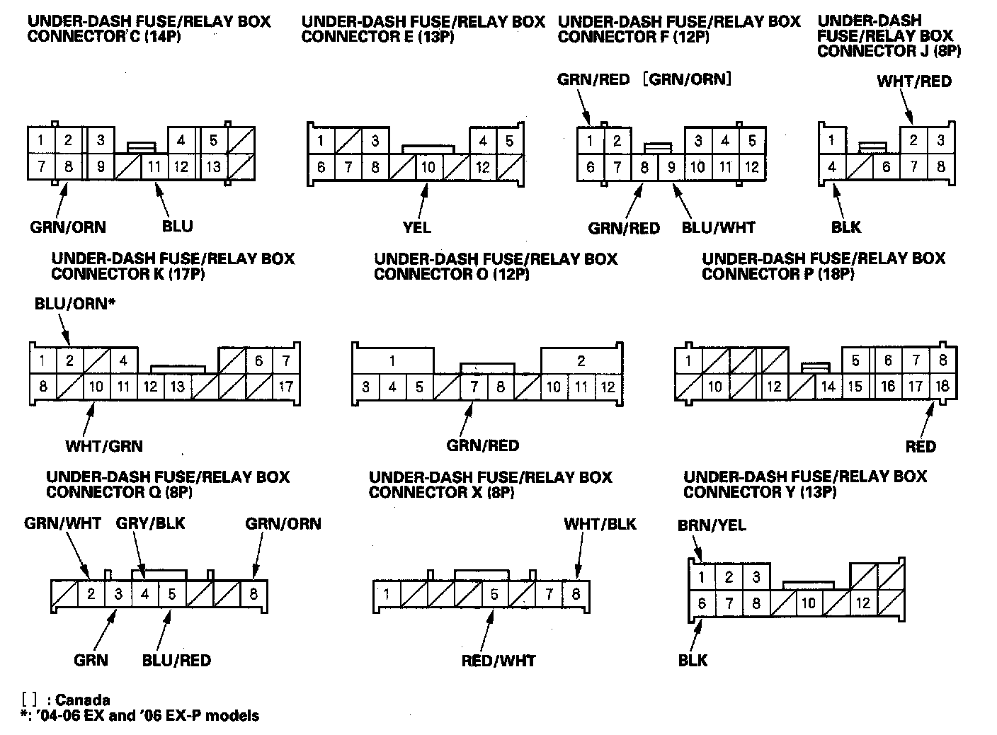 2. Disconnect the under-dash fuse/relay box connectors C, E, F, J, K, 0, P, Q, X and Y.