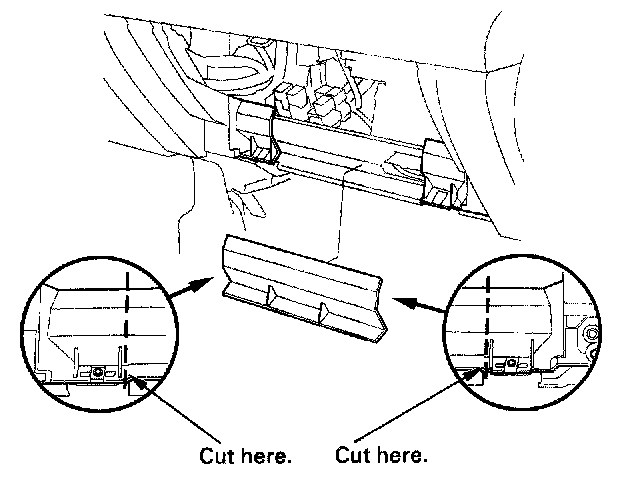 6. Cut the plastic cross brace in the glove box opening with diagonal cutters in the area shown, and discard it.
