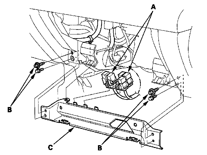 7. Remove the relays (A), then remove the bolts (B) and the glove box frame (C).