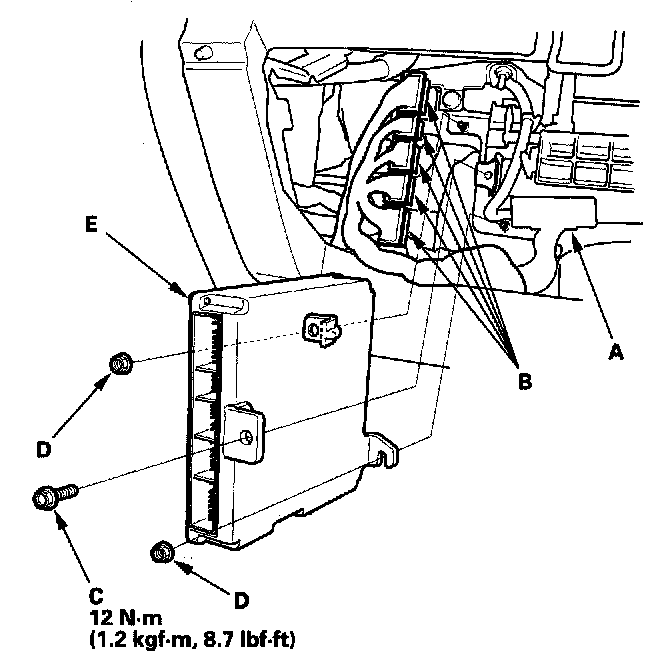 11. Remove the nuts (D), then remove the ECM/PCM (E).