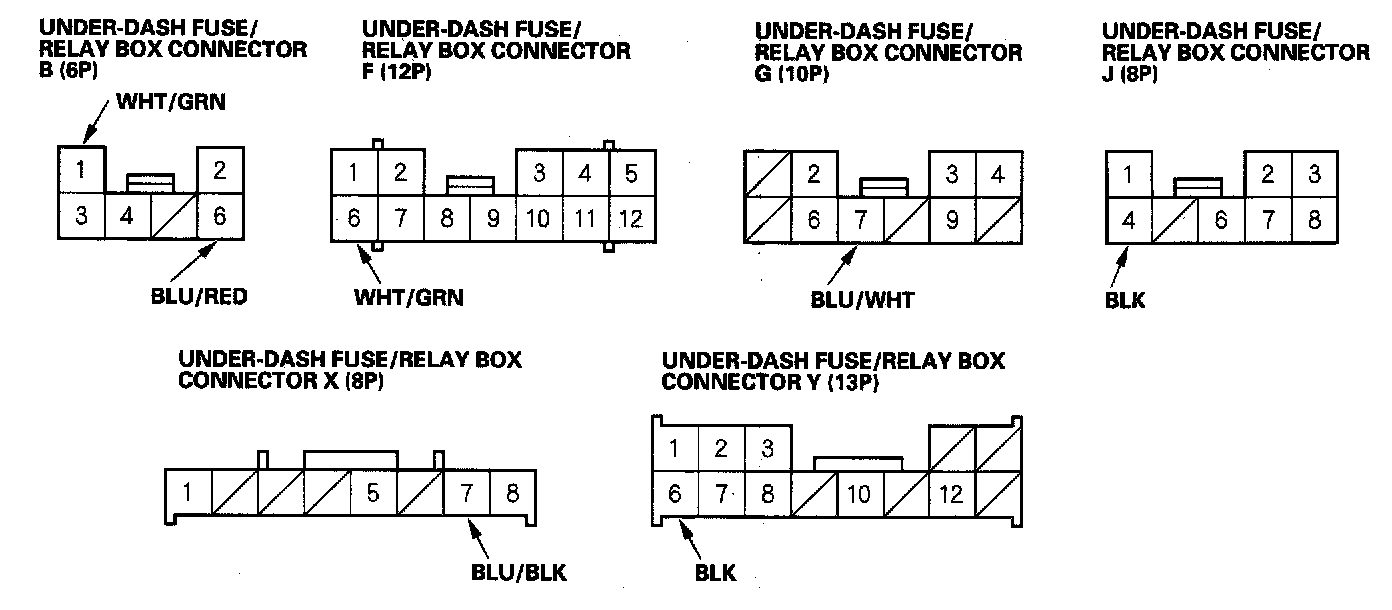 3. Disconnect the under-dash fuse/relay box connectors B, F, G, J, X and Y.
