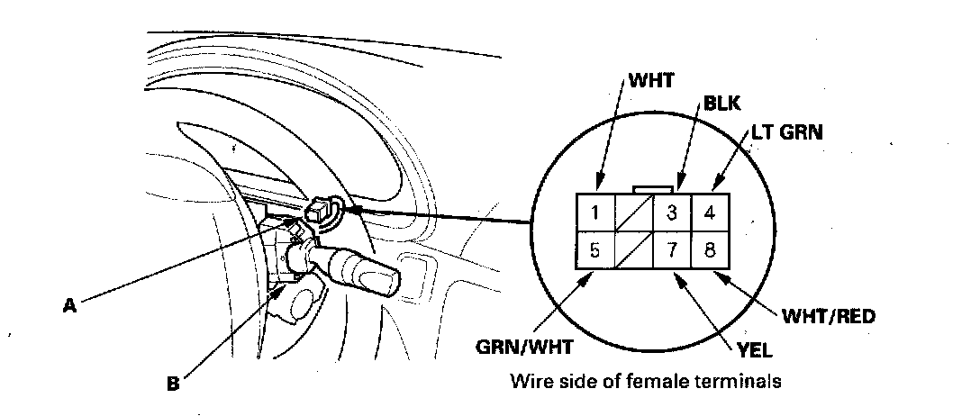 3. Remove the self-tapping screws, then disconnect the 8P connector (A) from the wiper/washer switch (B).