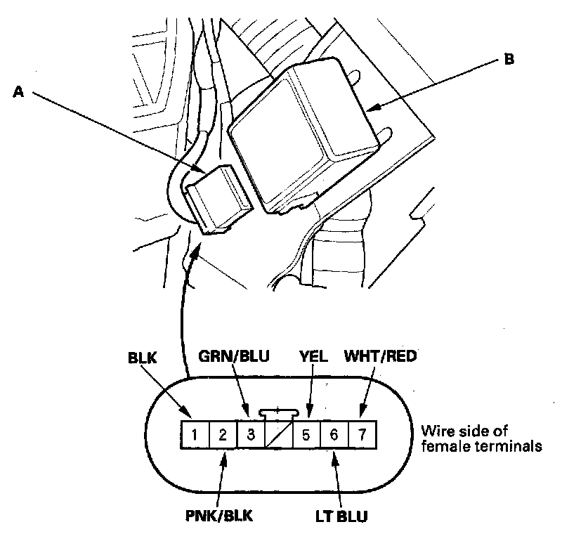 2. Disconnect the 7P connector (A) from the keyless receiver unit (B).