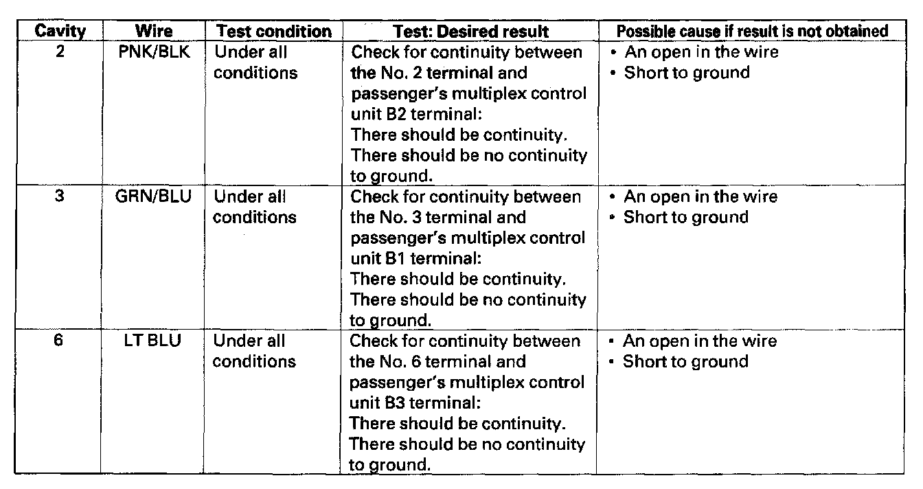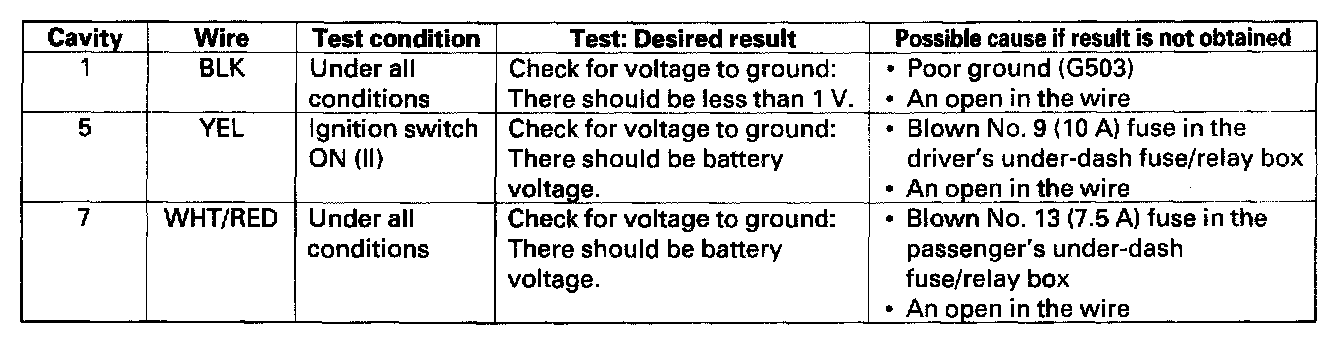 4. Reconnect the connector to the control unit, and make these input tests at the connector.