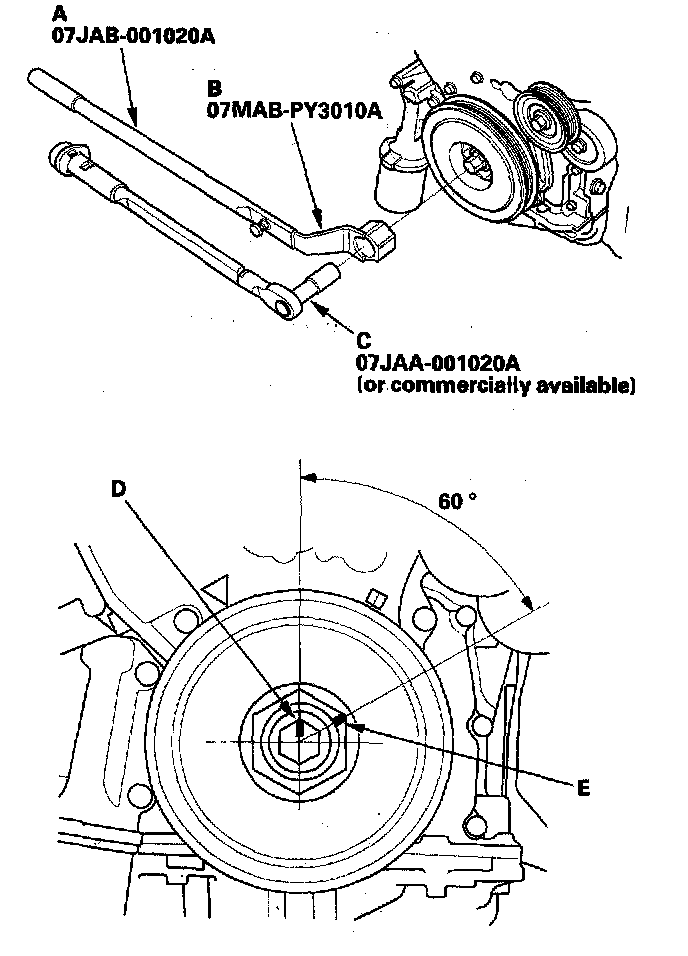 2 Mark the bolt head (D) and crankshaft pulley (E) as shown, then tighten the bolt an additional 60° (The mark on the bolt head lines up with the mark on the crankshaft pulley).