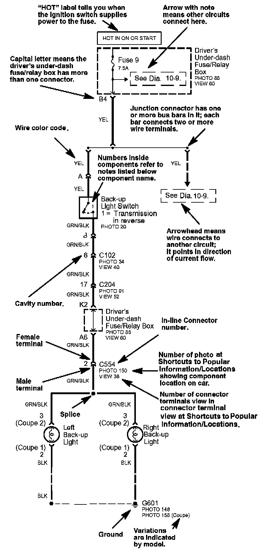 Below most connector numbers and component names are PHOTO and VIEW numbers. The PHOTO number refers to a photo at shortcuts to Popular Information/Locations that shows the connector's location on the car. The VIEW number refers to an connector view at shortcuts to Popular Information/Locations that shows the connector terminals, wire colors, connector cavity numbers, and other details.