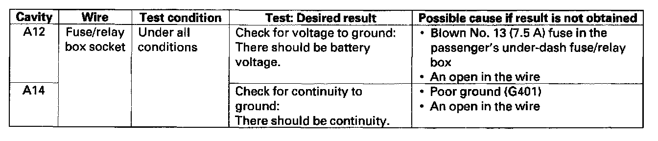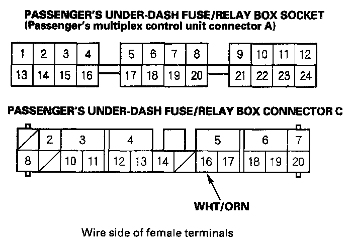 4. With the passenger's multiplex control unit still disconnected, make these input tests at the passenger's underdash fuse/relay box socket.
