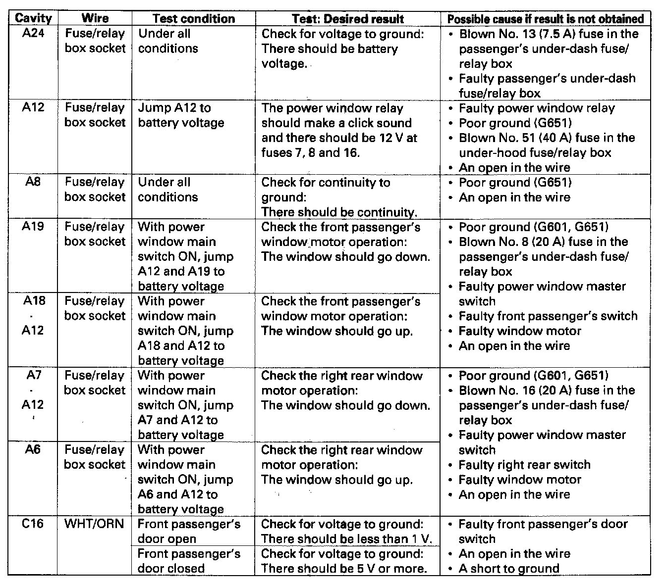 9. Remove the passenger's multiplex control unit from the passenger's under-dash fuse/relay box and connect fusel relay box socket terminal A12 to battery voltage. This4urns the power window relay on.