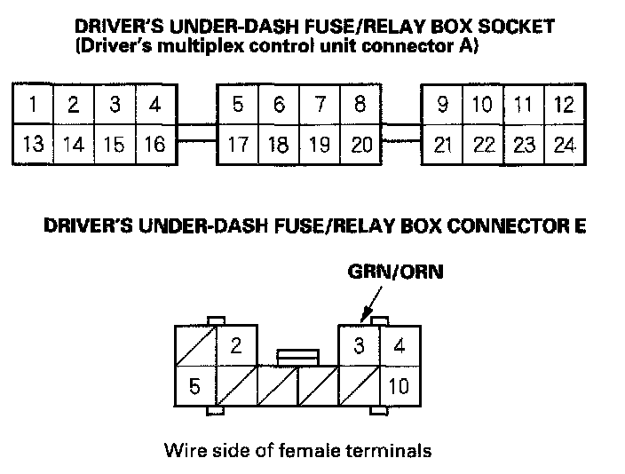 7. With the driver's multiplex control unit still disconnected, make these input tests at the driver's under-dash fuse/relay box socket.