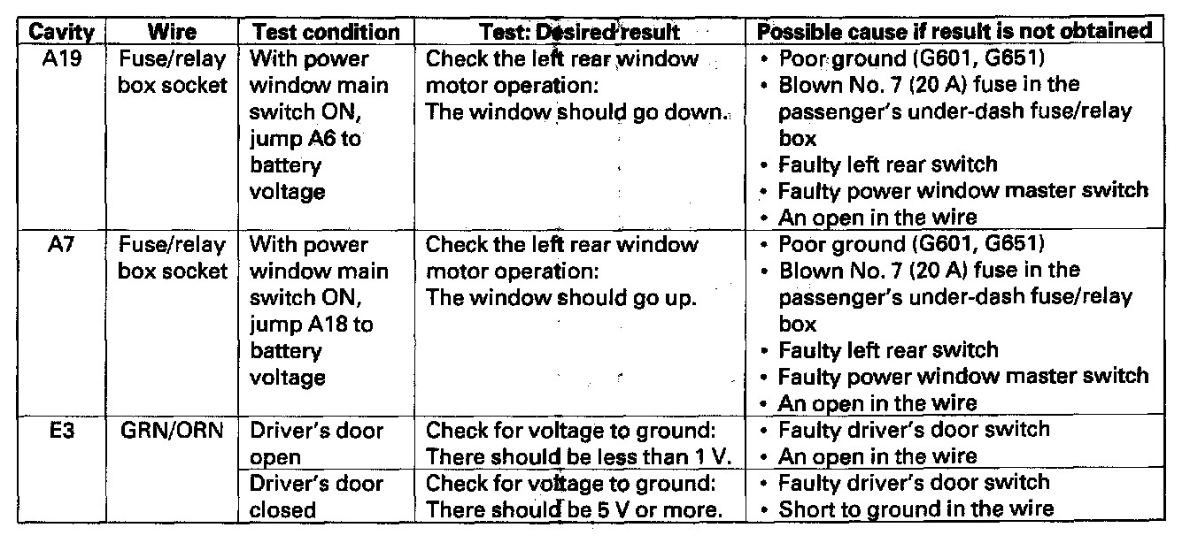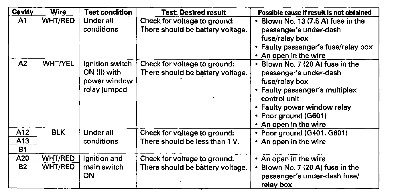 NOTE: For the terminals A4, A5, A10, A11, and A14, refer to the power window control unit input test.