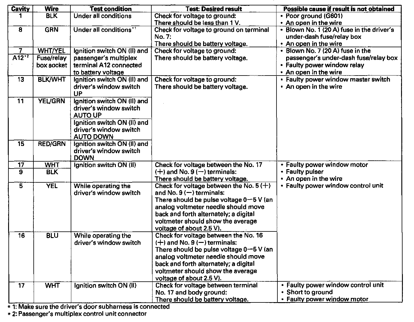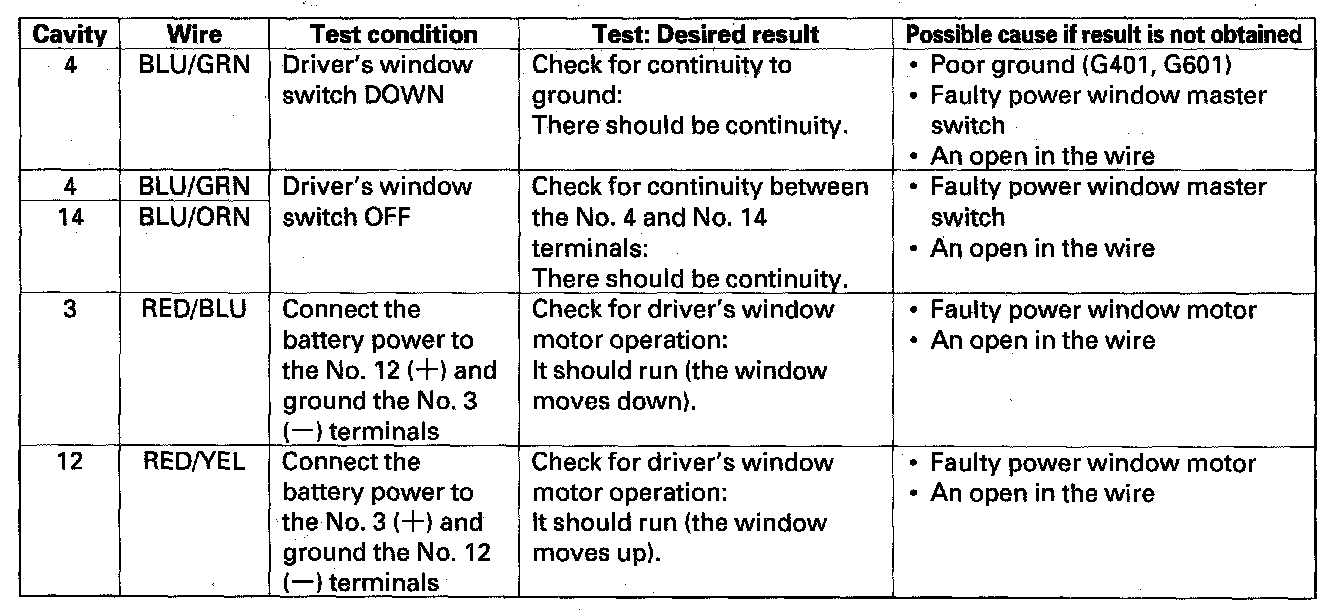Home >> Honda >> 2006 >> Pilot 4WD V6-3.5L >> Repair and Diagnosis >> Windows and Glass >> Windows >> Power Window Control Module >> Testing and Inspection >> Pinout Values and Diagnostic Parameters >> Power Window Control Unit Input Test