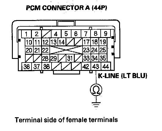 NO - Repair open in the wire between DLC terminal No. 7 and the PCM (A43). After repairing the wire, check for a DTC with the HDS, and go to the indicated DTC's troubleshooting.