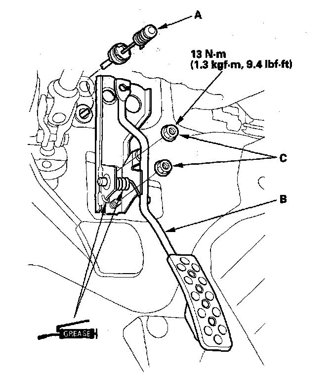 Remove the throttle cable (A) from the accelerator pedal(B).