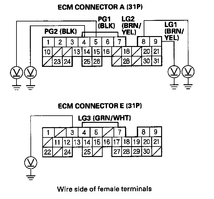 31. Check for continuity between ECM connector terminal E24 and body ground.