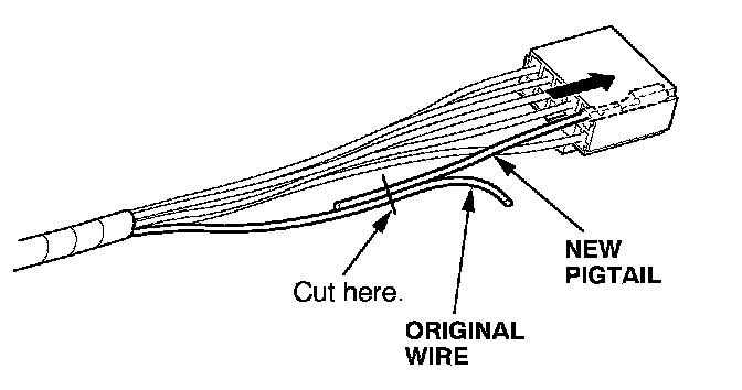 6. Lay the pigtail and the original wire side-by-side, and cut off both ends at once. If you are making more than one splice, do not cut each pigtail at the same location; the resulting "lump" of splice connectors would interfere with rewrapping the harness. Instead, cut the first pigtail close enough to the terminal so you will have room to make each remaining cut about 20 mm (3/4 inch) farther down on the next pigtail.