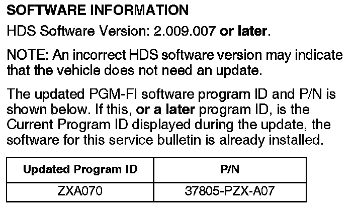 Update the PGM-FI software with the HDS and software version 2.009.007 or later. Refer to Service Bulletin 01-023, Updating Control Units/Modules.