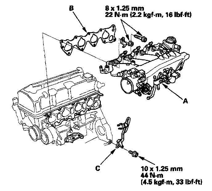 (A) with a new gasket (B), then install the intake manifold stay.