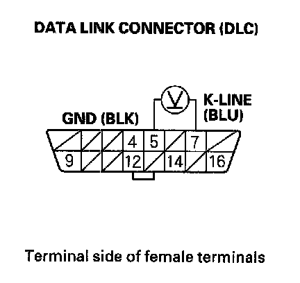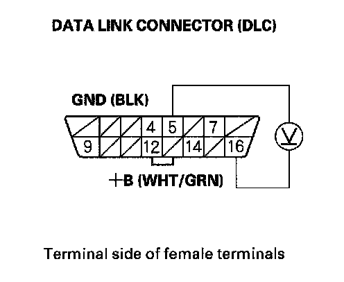 3. Measure voltage between DLC terminals No. 5 and No. 16.