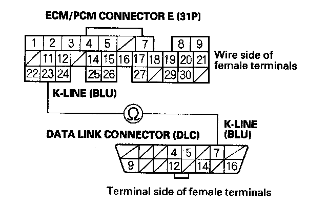 NO - Repair open in the wire between DLC terminal No. 7 and the ECM/PCM (E23). After repairing the wire, check for a DTC with the HDS, then go to the indicated DTC's troubleshooting.