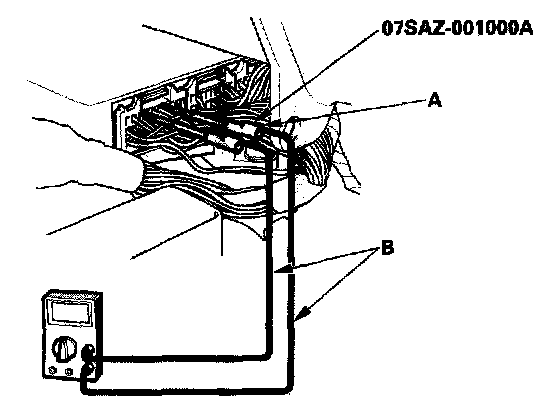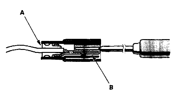 3. If you cannot get to the wire side of the connector or the wire side is sealed (A), disconnect the connector, and probe the terminals (B) from the terminal side. Do not force the probe into the connector.
