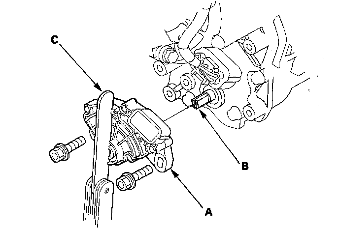 7. Align the cutouts (A) on the rotary-frame with the neutral positioning cutouts (B) on the transmission range switch (C), then put a 2.0 mm (0.08 inch) feeler gauge blade (D) in the cutouts to hold the switch in the N position.