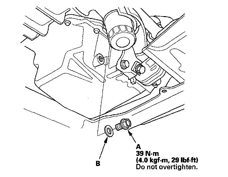 3. Reinstall the drain bolt with a new washer (B).