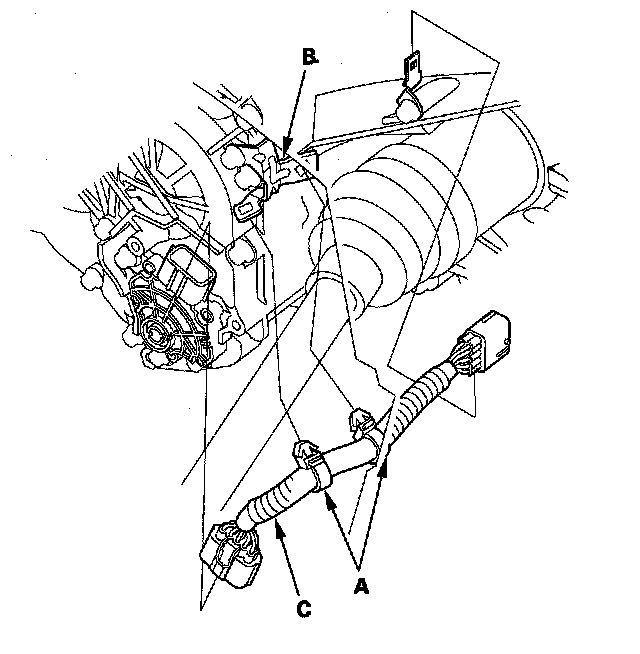8. If the transmission range switch continuity check is OK, remove the harness clamps (A) from the clamp bracket (B), and replace the faulty transmission range switch harness (C).