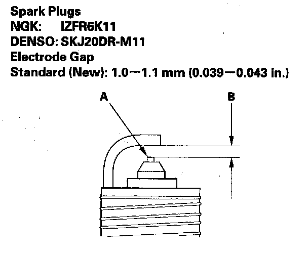 3. Replace the plug at the specified interval, or if the center electrode is rounded (A), or if the spark plug gap (B) is out of specification. Use only the listed spark plugs.