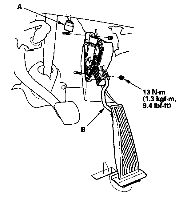 2. Remove the accelerator pedal module (B).