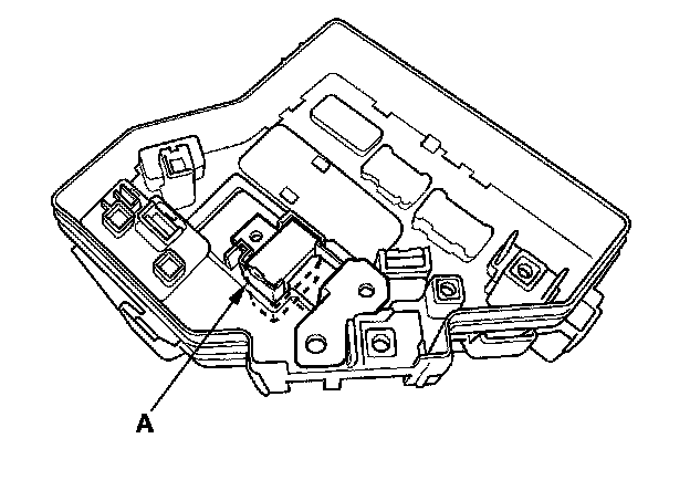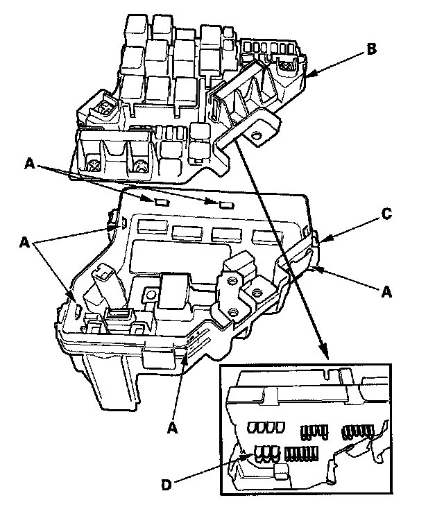 5. Turn the housing over again. Using two flat-tip screwdrivers, release the tabs (A), and pry up the fuse/relay box base (B) from the fuse/relay box housing (C).