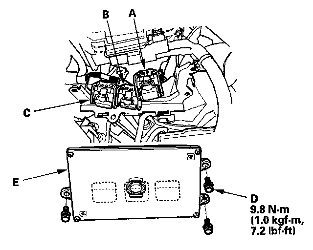 14. Remove the bolts (D), then remove the ECM/PCM (E).